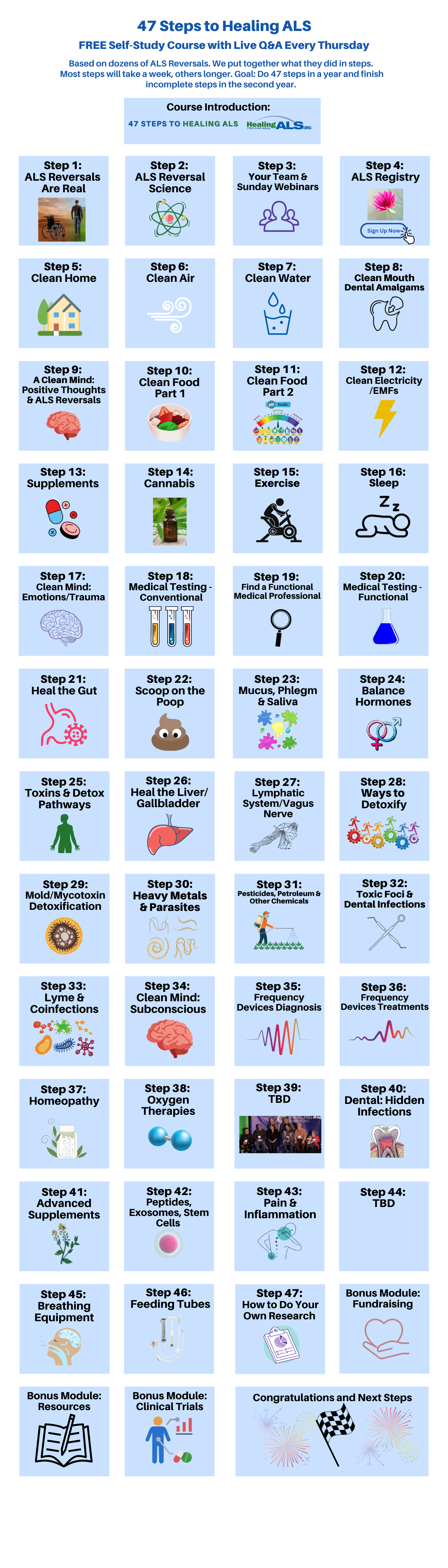 | | It's not too late to join the FREE 47 Steps to Healing ALS course. Please share this life-changing course with fellow PALS and CALS in your ALS community. Details below. |
