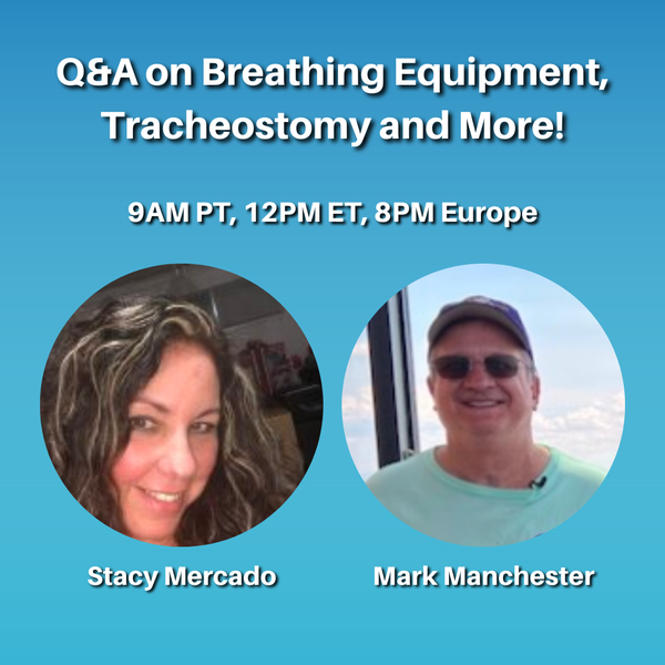 schedule: Tuesday Feb 14, 9am PT, 12pm ET, 6pm Europe. Stacy Mercado, CRT Respiratory Therapist, and Mark Manchester, 3 years on a trache and now off, host a Q&A on breathing equipment, tracheomosty and more!