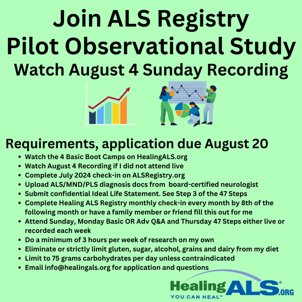 Thursday August 8: All PALS and CALS, join us for the new format of 47 Steps to Healing ALS.This week Step 29 Pain and Inflammation. Learn about emotional healing, staying positive and cover one step per week of the 47 Steps. Be part of this exceptional group of PALS dedicated and determined to slow, stop and reverse ALS while living a healthy and enjoyable life no matter what their current condition.
