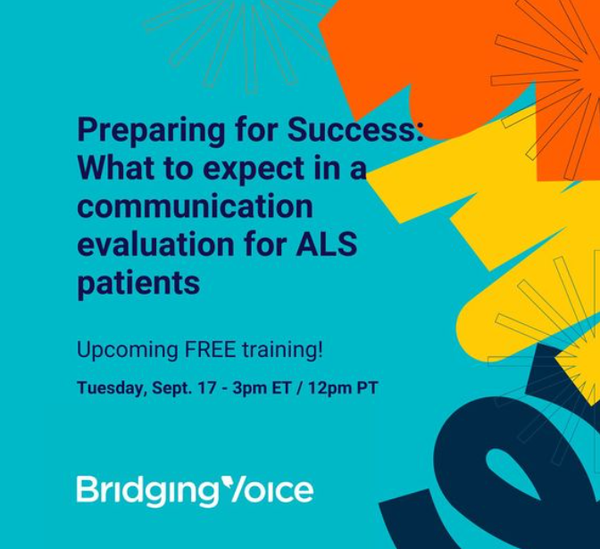 | September 17th 3pm ET/12pm PT Free Zoom Training. Join Bridging Voice and learn how pALS and cALS can best prepare and what questions you should have ready in preparation for a Communication Evaluation. Register Here |