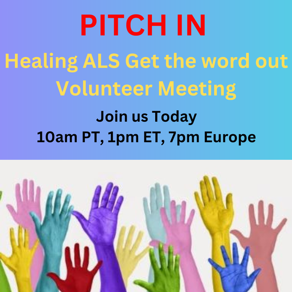 | COME TODAY IF YOU CAN! Help us share Healing ALS in the next four days! Healing ALS Volunteer Meeting 10am PT, 1pm ET, 7pm Europe. New volunteers welcome. Even if you only have one