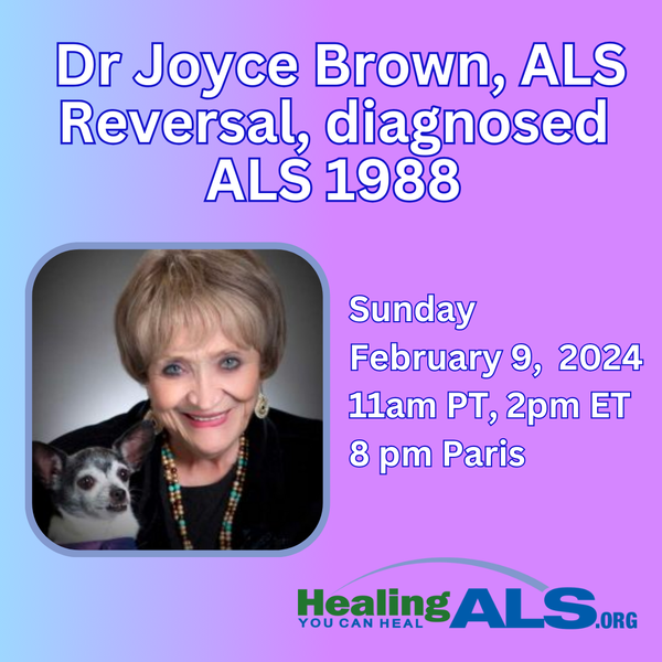 Sunday February 9, 2025, 11am PT, 2pm ET, 8 pm Paris Dr Joyce Brown, ALS Reversal, diagnosed ALS 1988.