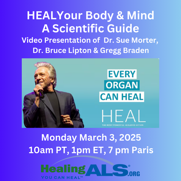 NEW TIME Healing ALS Monday Expert Talk: 10am PT, 1pm ET, 7 pm Paris. HEAL Your Body & Mind A Scientific Guide. Video Presentation of Dr. Sue Morter, Dr. Bruce Lipton & Gregg Braden. Discover the power of beliefs, heart-brain coherence and epigenetics to reprogram your mind.