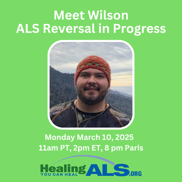 NEW TIME Healing ALS Monday Expert Talk: 10am PT, 1pm ET, 7 pm Paris. Meet Wilson, ALS Reversal in Progress.Wilson is living life to the fullest with ALS while he heals.Diagnosed at 40 years old, he uses a variety of healing strategies to stay well. Don't miss his story. Register Here