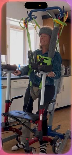 family were especially resourceful in creating a way for Kellie to walk. Kellie is using her walker and Hoyer lift, both on loan from her local ALS Association, combined with a harness she purchased online. They put extra padding for comfort and Kellie is supported so she can walk!! An upright position helps circulation to all of the organs, energizes the lymphatic system for detoxification and improves muscle strength and bone