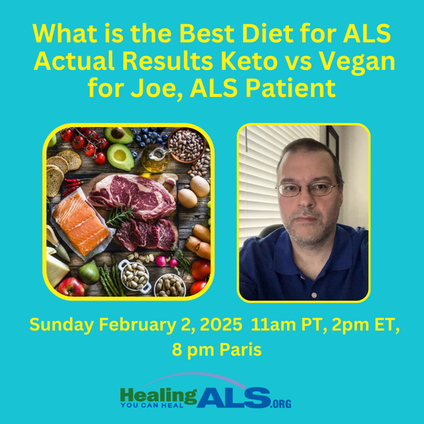Sunday February 2, 2025 11am PT, 2pm ET, 8 pm Paris. What is the Best Diet for ALS, Actual Results Keto vs Vegan for Joe, ALS Patient