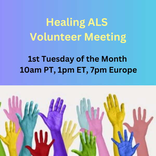 | Tues Feb 4. Healing ALS Volunteer Meeting 10am PT, 1pm ET, 7pm Europe We meet the 1st and 3rd Tuesday of the month. New volunteers welcome. Even if you only have