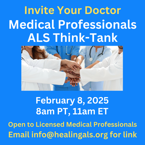 8, 2024 8am PT, 11am ET. Invite your doctor, naturopath, or other medical professional to our medical professionals ALS think tank. The group meets once a month led by Dr. Lee Cowden, MD to discuss ALS topics. Ask your medical professional to send an email info@healingals.org.