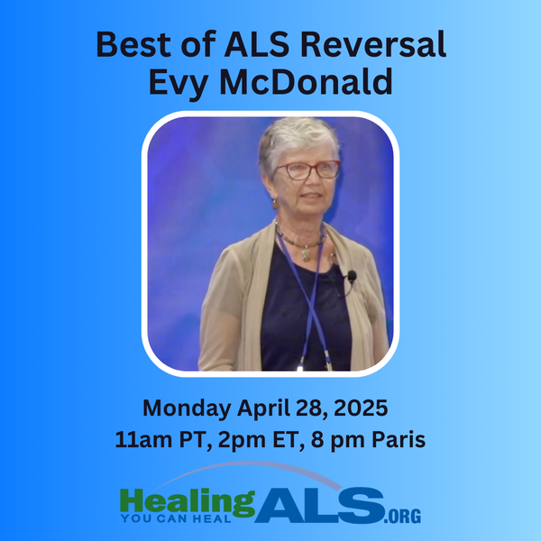 Monday April 28: Healing ALS Monday Expert Talk: 10am PT, 1pm ET, 7 pm Paris. Best of Healing ALS Recordings. Reversal Evy McDonald was diagnosed with ALS in 1980. Today she is in her 70's and thriving. Dr. Bergeron's testing presentation will be rescheduled to May.