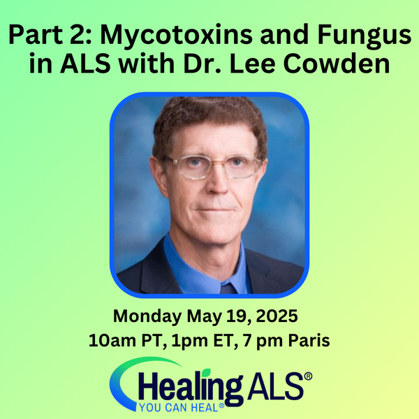 Monday May 19: Healing ALS Monday Expert Talk: 10am PT, 1pm ET, 7 pm Paris. Mycotoxins and Fungus in ALS with Dr. Lee Cowden Mycotoxins areone of the major contributing factors of ALSand fast-progressing ALS symptoms.